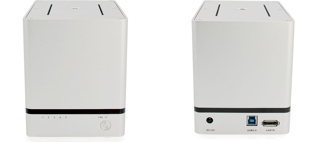 ★ Supports 5pcs 2.5", 12.5mm thickness SATA HDD/SSD, Capacity up to 2TB*5=10TB ★ High quality aluminum frame is fashion and cool ★ Tool less and screw free design make HDD easy to use and maintain ★ USB 3.0 interface can transmit data up to 5Gbps, and USB 2.0/USB 1.1-compatible ★ eSATA interface transmission speed up to 3Gbps ★ Hot swap available ★ Supports Raid Model: RAID 0/1/10/3/5/JBOD/Nor ★ The front-LED indicator shows power and access status, and HDD malfunction ★ 6cm noiseless fan with smart temperature control system makes well heat-dissipation ★ Security system can protect HDD and data from power short circuit ★ RAID software can be downloaded from our website to easily check the RAID status ★ HDDs switching on in sequence design |